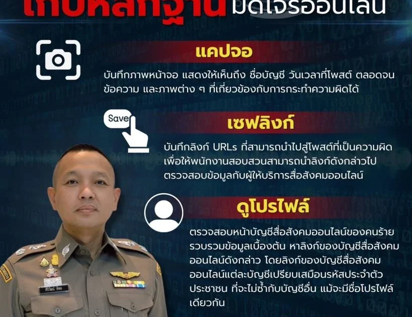 สำนักงานตำรวจแห่งชาติ จึงขอแนะนำ 3 ขั้นตอนเบื้องต้น ในการเก็บรวบรวมพยานหลักฐาน ก่อนที่จะไปแจ้งความร้องทุกข์ต่อพนักงานสอบสวน คือ “แคปจอ เซฟลิงก์ ดูโปรไฟล์” โดยมีรายละเอียดดังต่อไปนี้