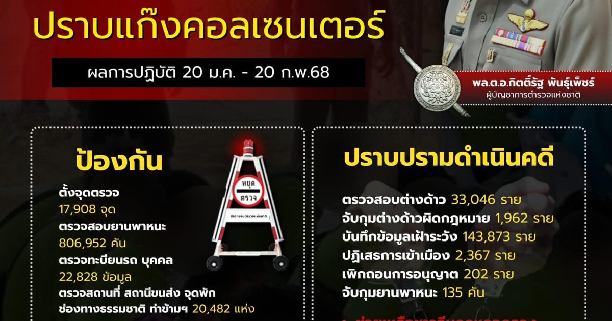 พล.ต.อ.กิตติ์รัฐ พันธุ์เพ็ชร์ ผู้บัญชาการตำรวจแห่งชาติ ( ผบ.ตร. ) สั่งการตำรวจทุกหน่วยที่เกี่ยวข้องเดินหน้าปฏิบัติตาม 7 มาตรการ ปราบปรามต่างด้าวผิดกฎหมาย และปราบปรามแก๊งคอลเซนเตอร์