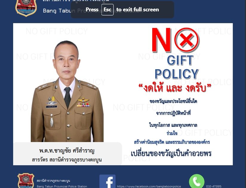 เมื่อวันที่ 25 ธ.ค. 66 เวลา 10.00 น. พ.ต.ท.ชาญชัย ศรีสำราญ สว.สภ.บางตะบูน และข้าราชการตำรวจ ร่วมกันประกาศเจตนารมณ์ที่จะสร้างมาตรฐานด้วยความโปร่งใส สร้างองค์กรให้ปลอดจากการทุจริต ในการปฏิบัติหน้าที่ยึดวัฒนธรรม คุณธรรมในองค์กรที่จะปฏิบัติหน้าที่ด้วยการมุ่งประโยชน์ส่วนรวมของคนในสังคม มีคุณธรรม ความสัมพันธ์ส่วนตัว มีการสื่อสารภายในหน่วยงานที่ชัดเจนทุกระดับ เพื่อเป็นแนวทางในการปฏิบัติหน้าที่ภายในองค์กร รวมทั้งเป็นค่านิยมสำหรับองค์กรหรือสถานีตำรวจภูธรท่าม่วง พึงยึดถือเป็นแนวทางปฏิบัติควบคู่กับกฎ ข้อบังคับอื่นๆ สำหรับที่จะสร้างองค์กรที่ใสสะอาดให้บริการด้วย